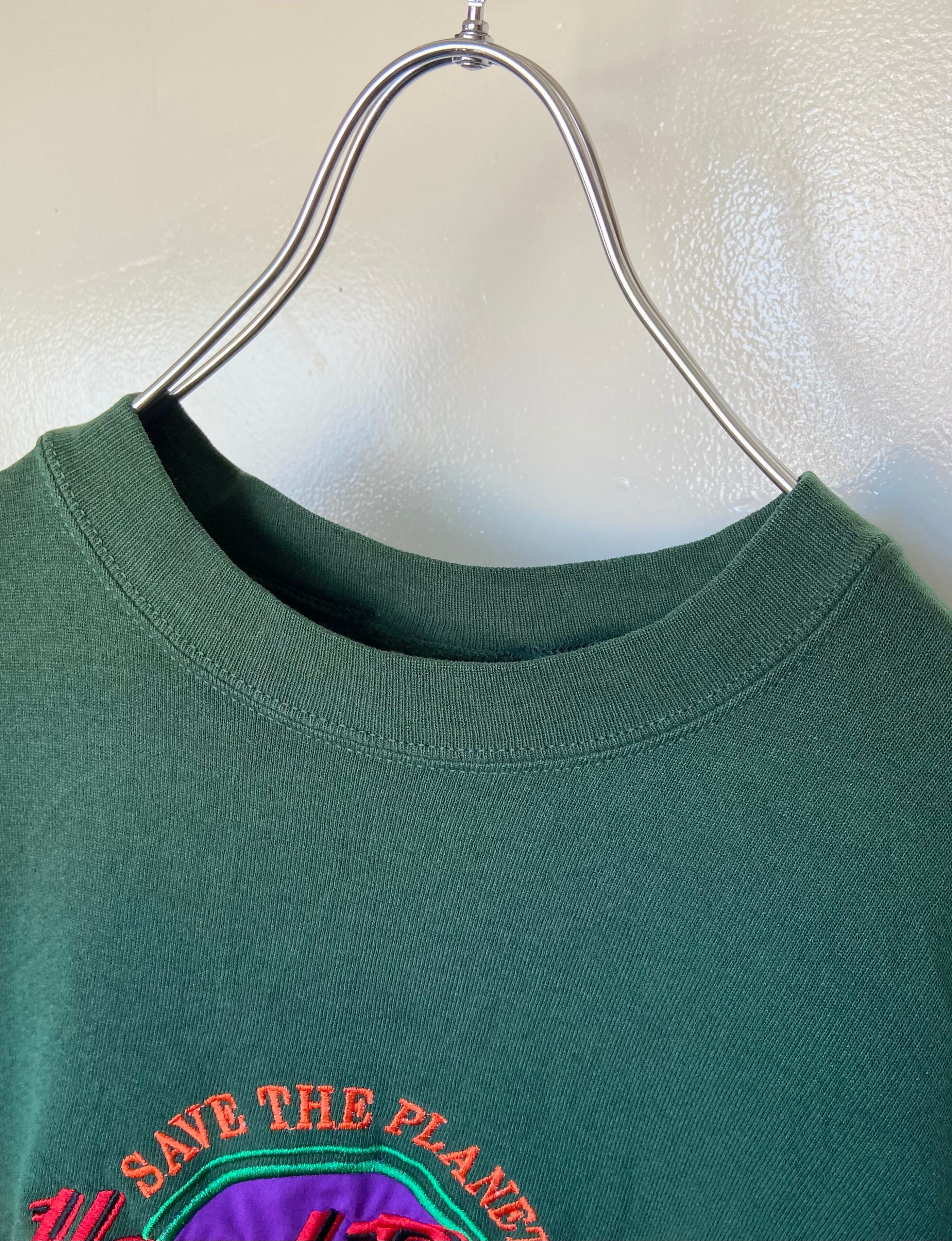 人気色の緑(グリーン)と紫刺繍が好デザイン。これからの時季に着やすいオーバーサイズのスウェットになります。